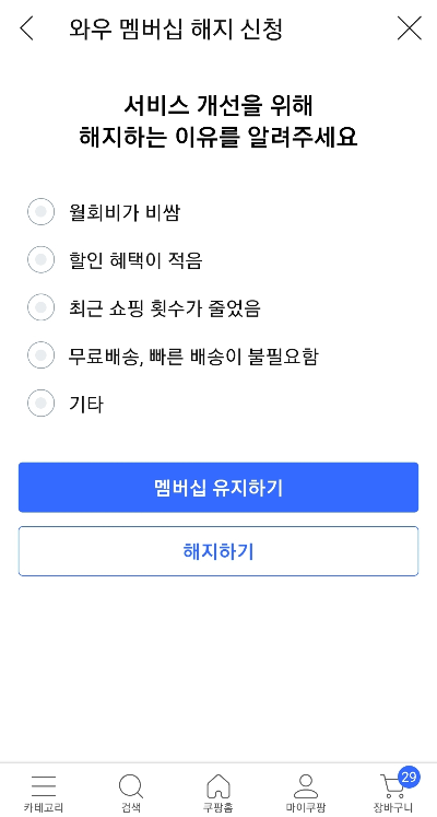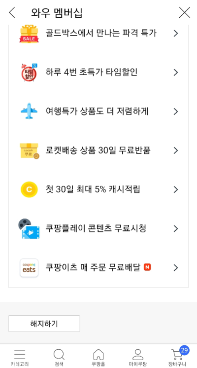 쿠팡이든 뭐든 멤버십 해지는 미리 예약해두는 걸 추천한다. 만기 다가오면 해지해야지 했다가 어느 새 한달이 지나서 월 요금이 자동결제된 경험이 한두 번이 아니다.