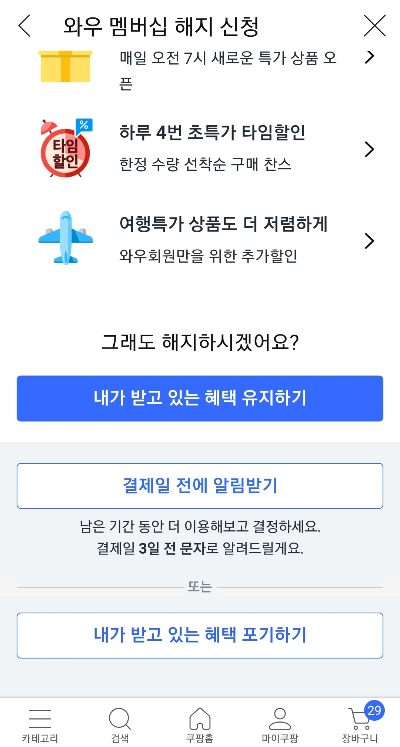해지하기 버튼을 누르면, 다음 결제일까지 기간이 이 만큼이나 남았고, 혜택이 사라진다고 장황하게 나열됨.