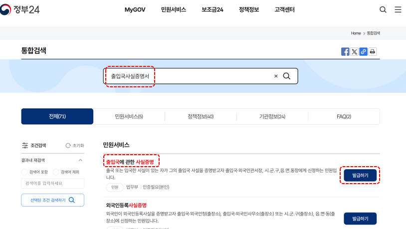 출입국사실증명서도 정부24에서 발급할 수 있다.
