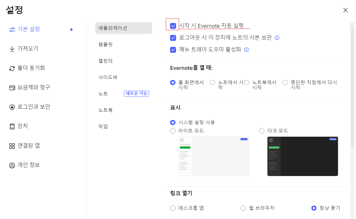 3. '시작 시 Evernote 자동 실행' 문구 앞의 체크박스 버튼 해제