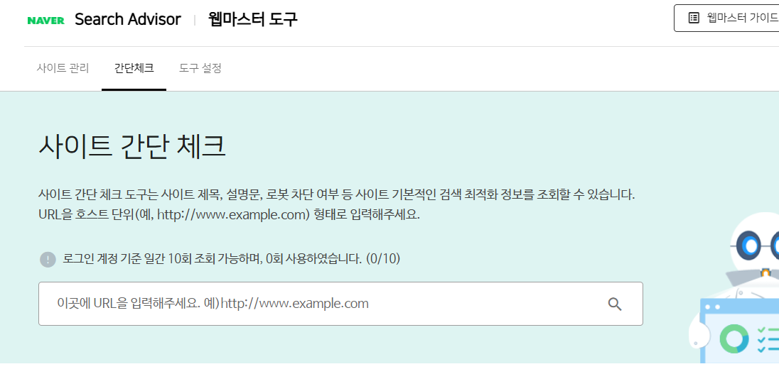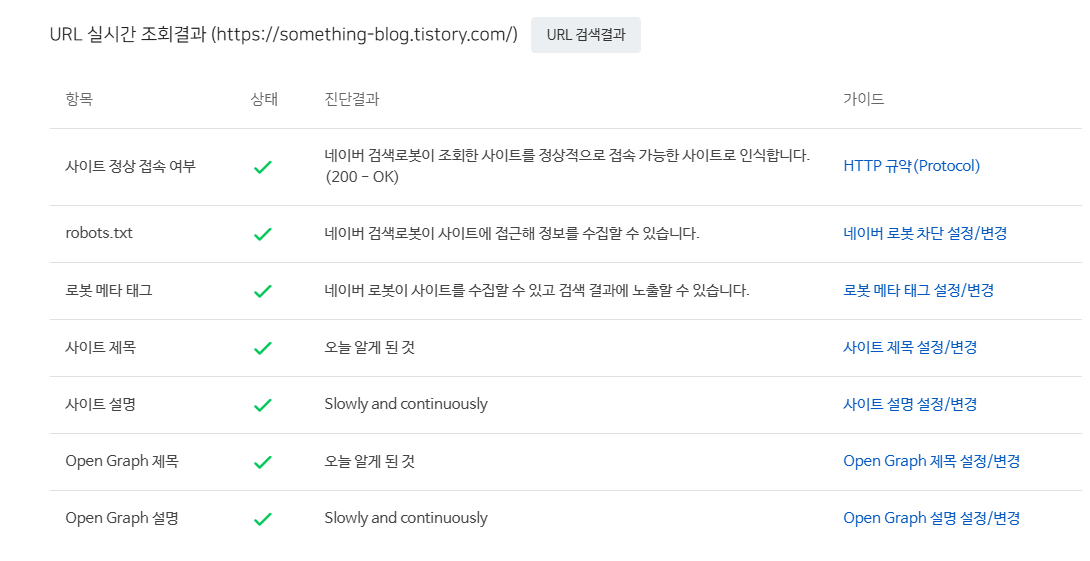 사이트 제목, 설명문, 로봇 차단 여부 등 사이트 기본적인 검색 최적화 정보를 조회