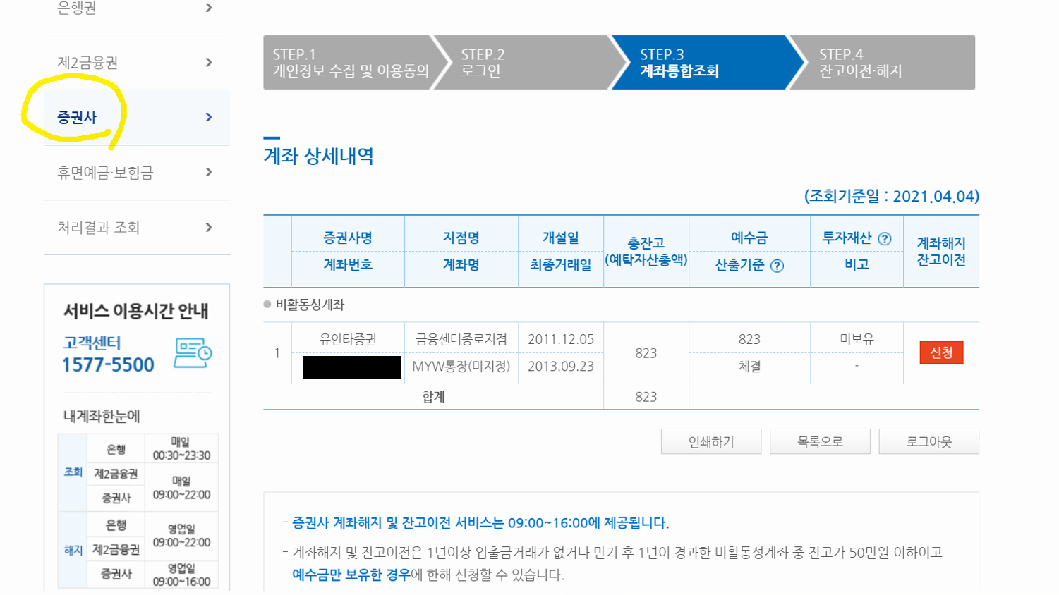 증권사 계좌 해지 및 잔고이전 서비스는 영업일 중 9시~22시에 진행가능 하네요.