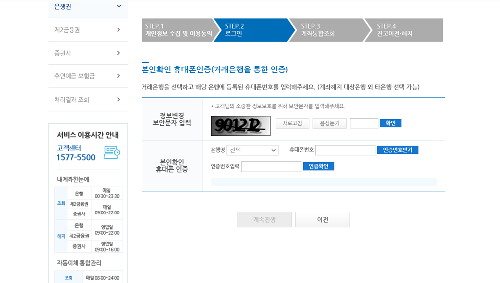 은행에 등록된 휴대폰 번호로 본인확인을 합니다. (은행선택-휴대폰번호 입력-인증번호 입력)