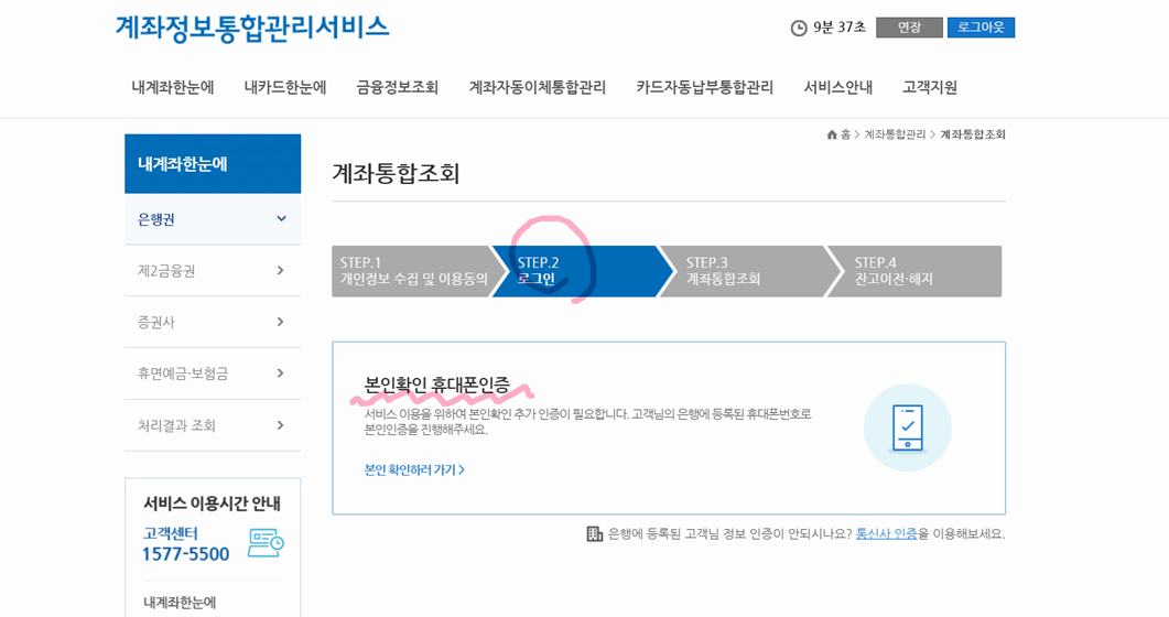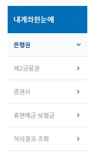 (1) 로그인한 뒤에는 은행권 / 제2금융권 / 증권사 등으로 카테고리를 나누어 계좌 확인 가능합니다