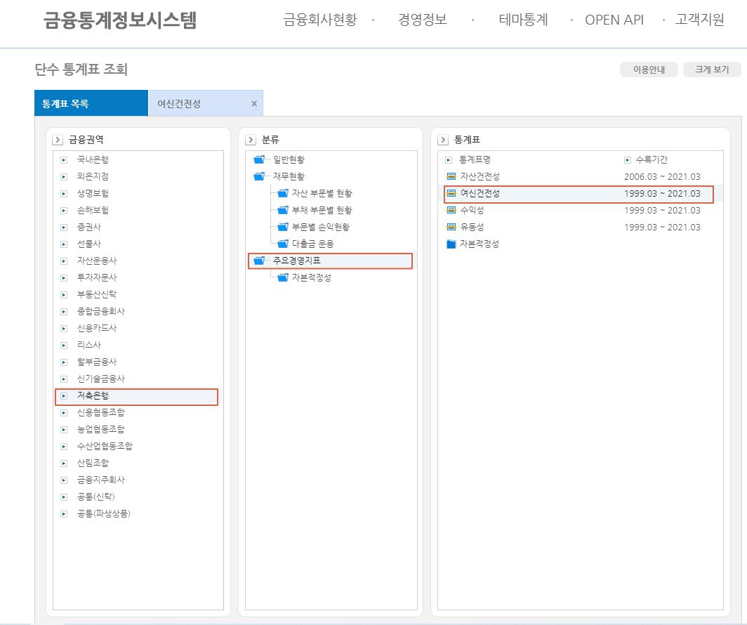금융감독원 금융통계정보시스템에서 금융회사의 각종 재무정보와 경영지표에 대한 정보를 비교하고 조회할 수 있다.