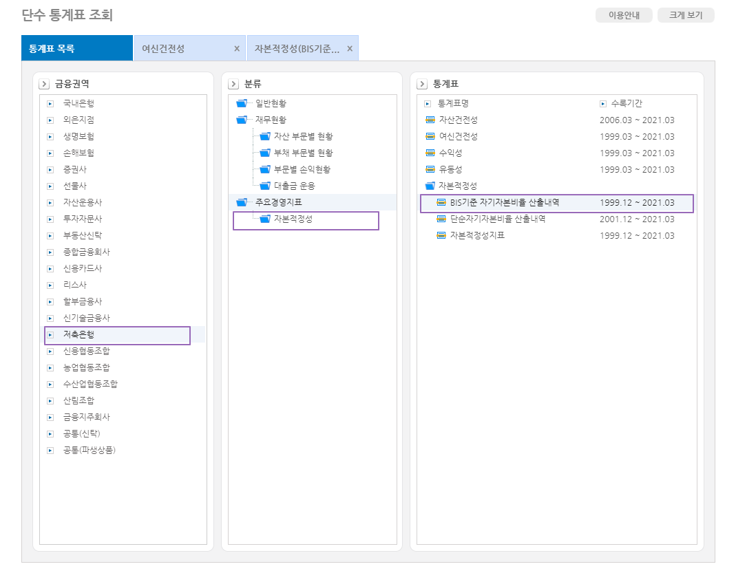 은행>국내은행을 선택하면 [통계표 조회] 페이지로 진입