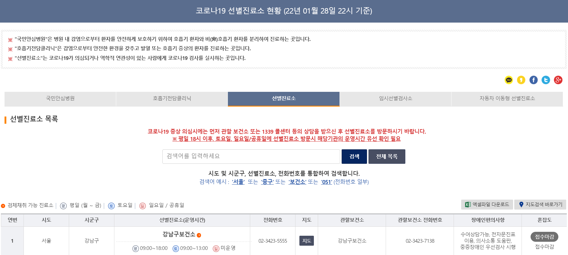 보건복지부 웹사이트 내에 전국 코로나19 선별진료소, 임시 선별검사소, 국민안심병원, 호흡기전담클리닉 목록을 공개하고 있다. 꾸준히 업데이트하고 있어 가장 최신화된 정보를 확인할 수 있다.