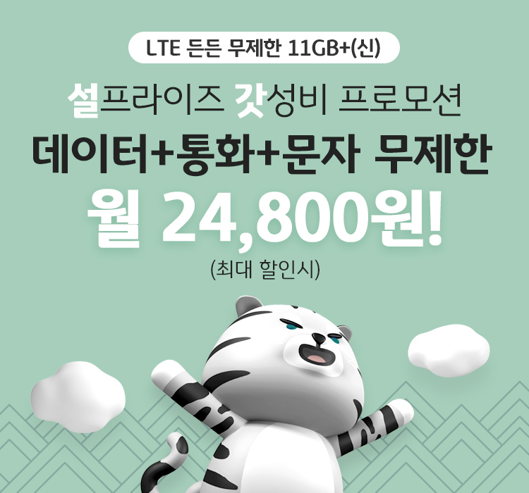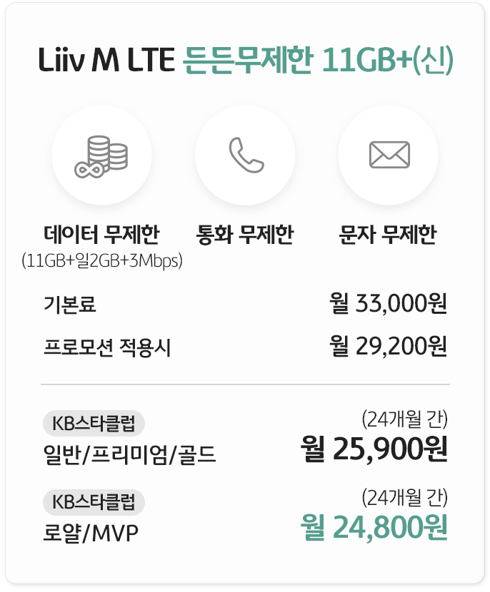 국민은행 계좌가 있다면 이벤트 가격으로 24개월 동안 월 25,900원에 11GB + 일 2GB +3Mbps의 데이터를 이용할 수 있다. 통화와 문자는 무제한이다.
