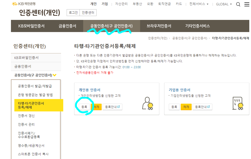 인증센터 → 타행·타기관 공동인증서 등록/해제 → 개인용 인증서 "등록" 클릭