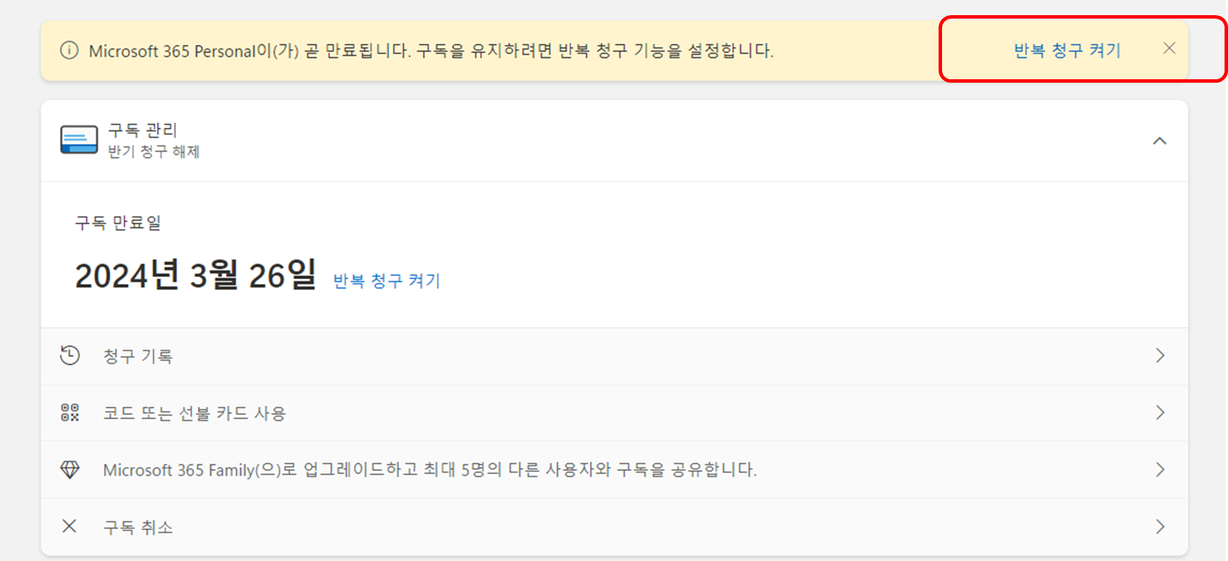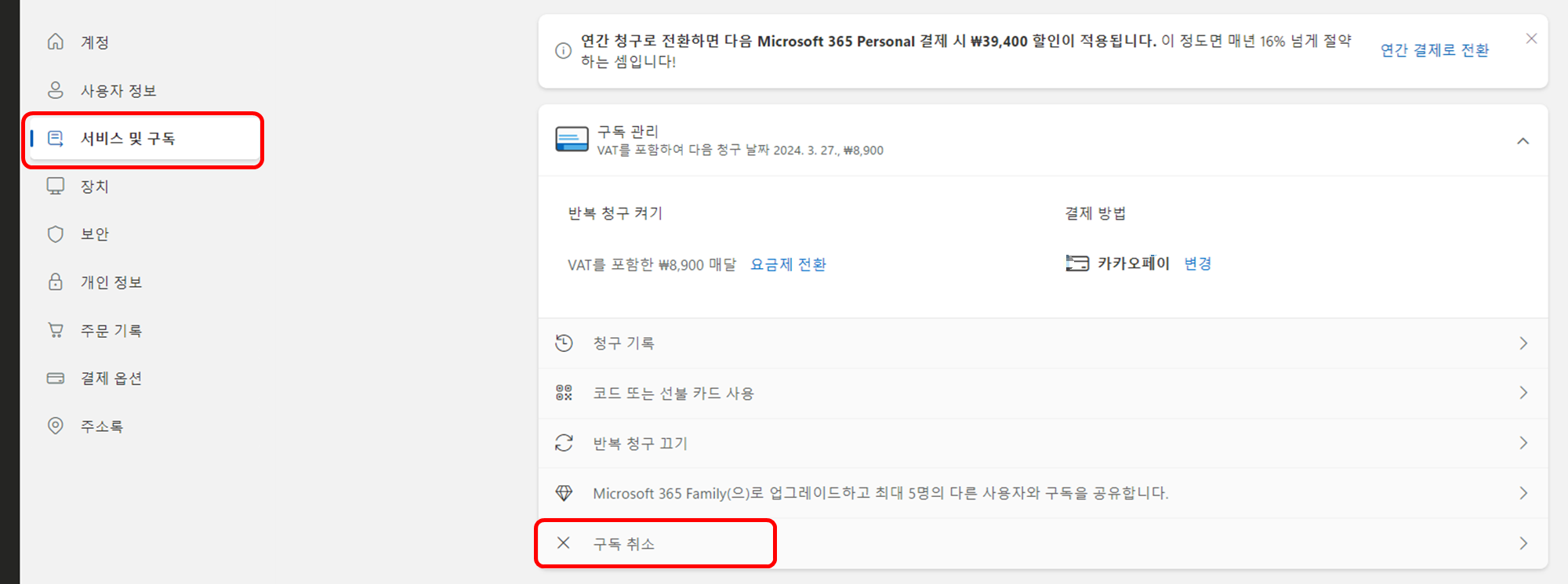 Microsoft 365 Personal 을 이용했는데, 당분간 필요하지 않아 구독을 해지했다. 한 달이라도 구독비를 아끼겠다는 심산!