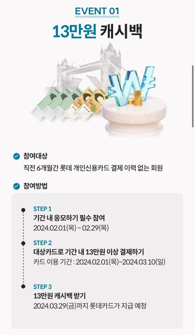지난 2월 중 이벤트에 응모하고 3월 10일까지 13만원 이상 결제하면 바로 그달에 카드대금 결제계좌로 캐시백 13만 원이 지급된다.