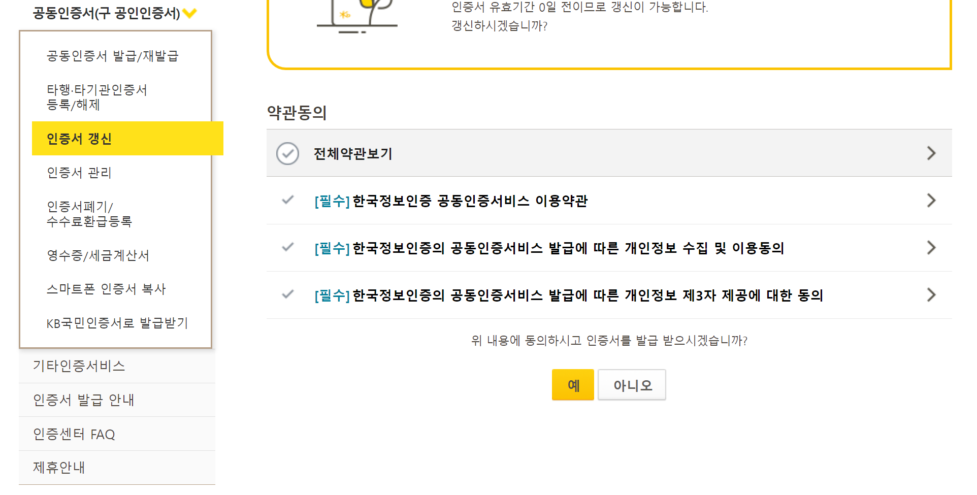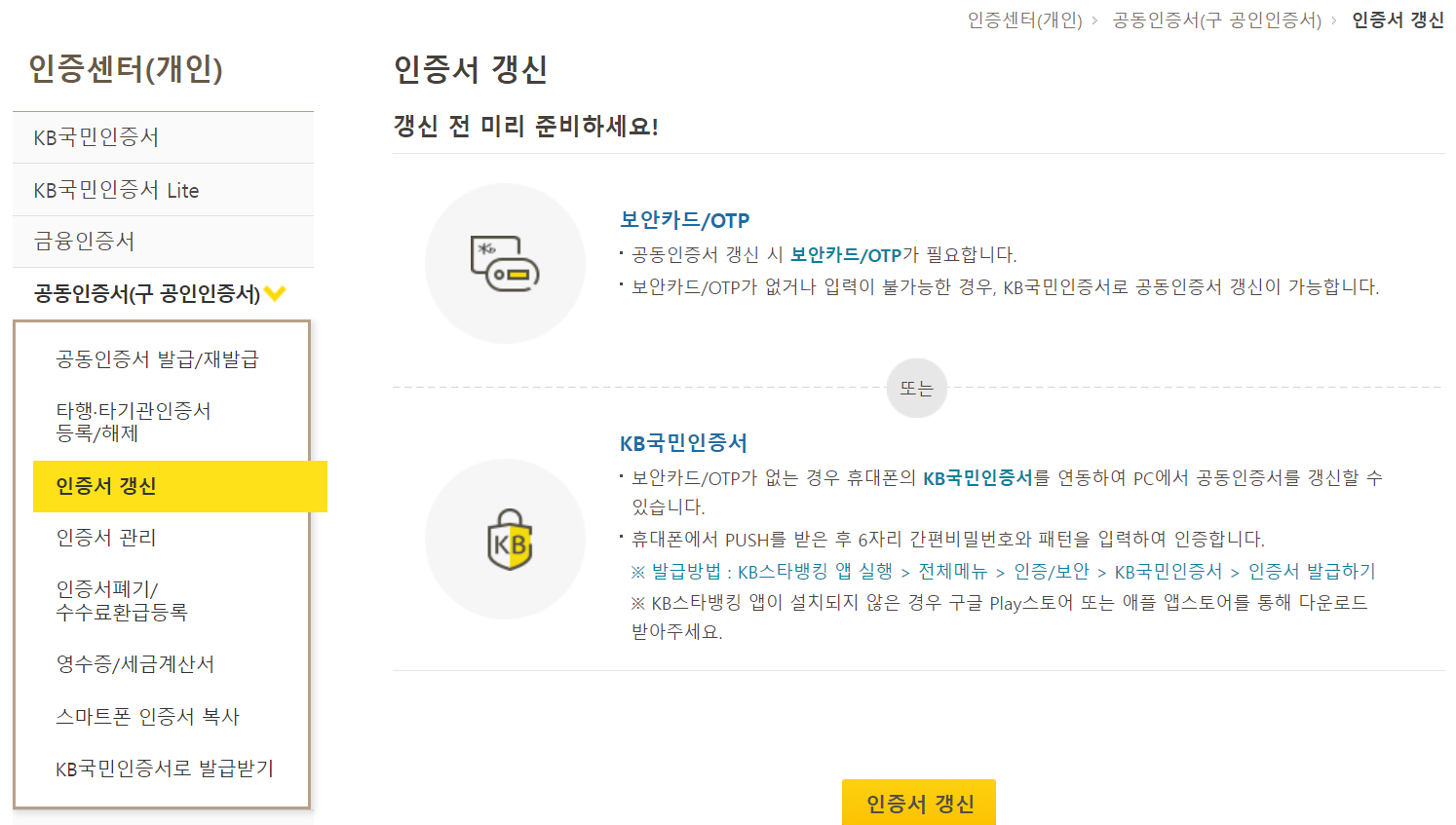 국민은행에 다시 접속해 '인증서 갱신' 시작.