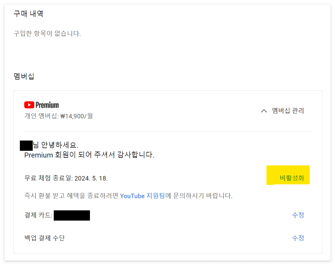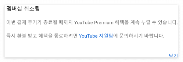제 날짜에 유튜브 프리미엄 구독이 취소되어 카드결제 되진 않겠지만, 혹시라도 결제 문제가 생기면 유튜브 지원팀에 문의하여 환불!