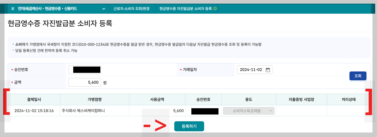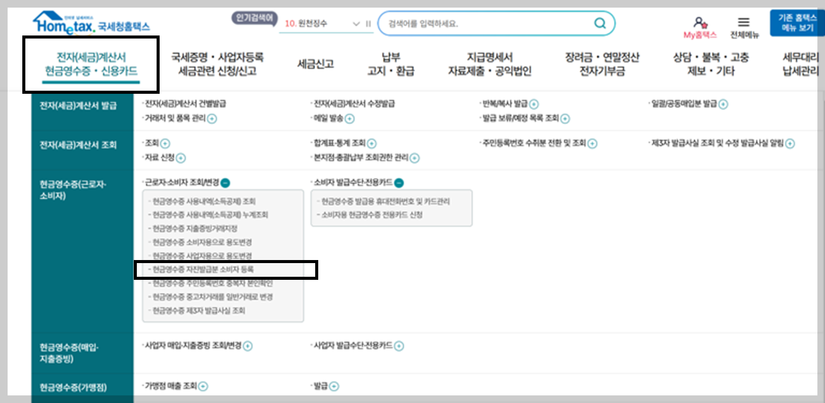 3. 현금영수증(근로자·소비자) > 현금영수증 자진발급분 소비자 등록 클릭
