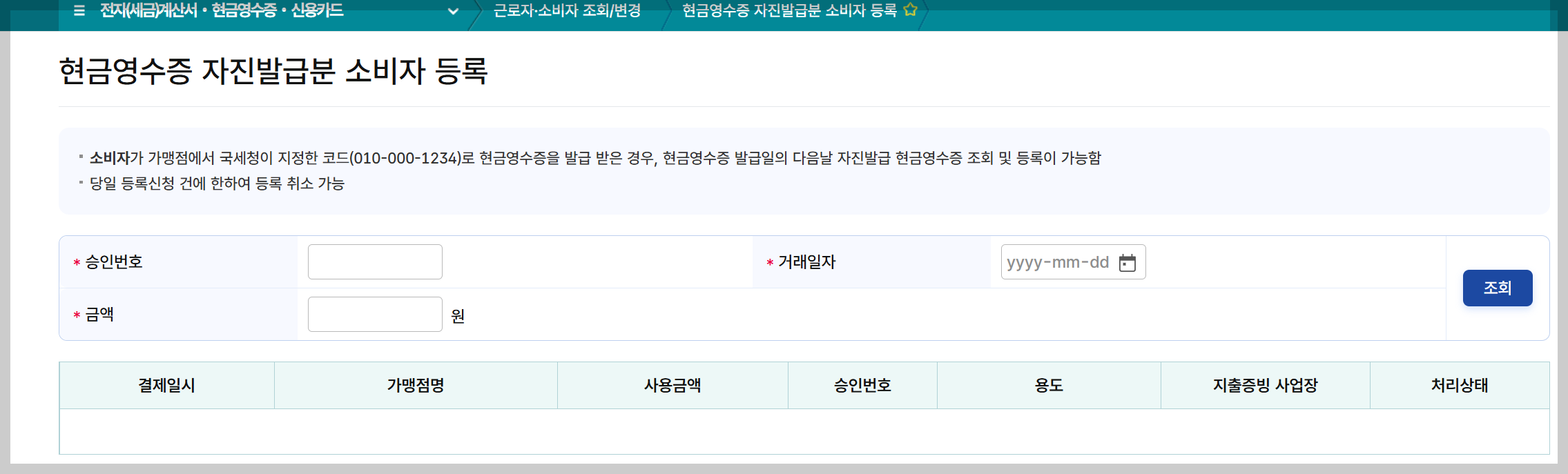 4. 승인번호, 거래일자, 금액 입력 후 조회 버튼 클릭