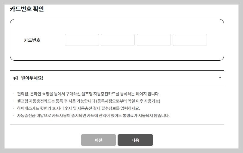 자동충전 식 하이패스 카드는 구입 후 반드시 카드등록을 먼저 한 뒤 사용해야 한다.