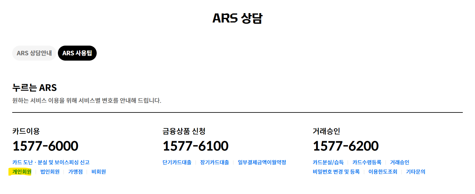 현대카드 홈피에선 원하는 서비스를 빠르게 찾을 수 있도록 서비스별 번호를 따로 안내한다.